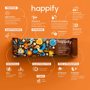 One Happify bar contains 20 grams of protein (with full amino acids profile), vitamins a, b complex, c, d & e, essential mineral electrolytes iron, magnesium & zinc, pre & probiotics, as well as an excellent source of fibre.